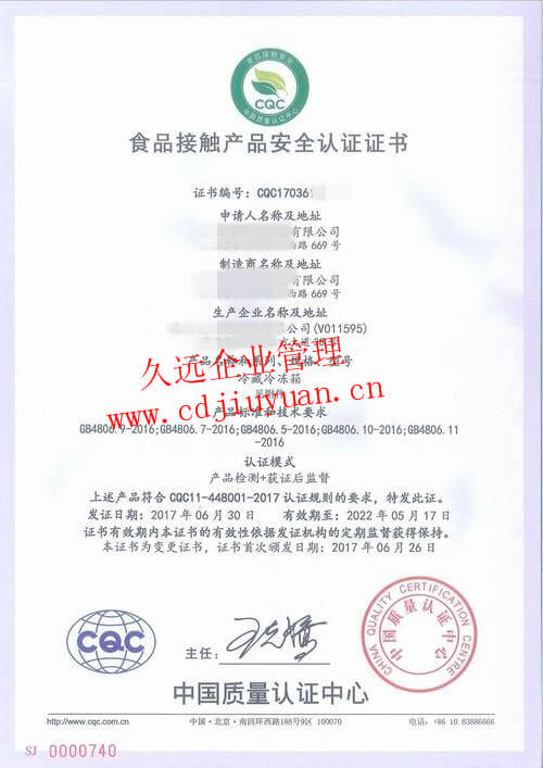 食品接觸產品安全認證證書